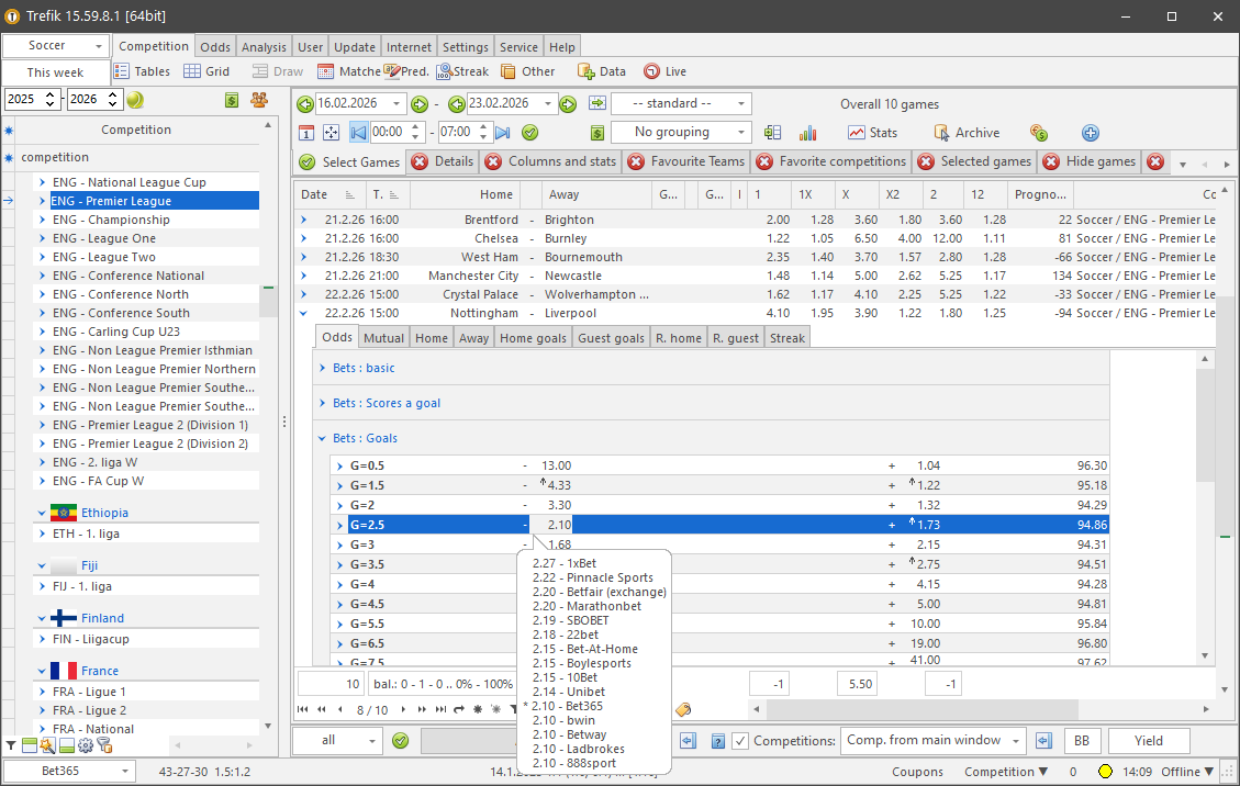 A huge database with sport results and odds directly on your computer! You can analyze the database using the Trefík features, check the efficiency of different betting strategies using the real odds at various bookmakers. You can get the extraordinary possibility how to check the efficiency of your own prediction strategy. Trefík contains odds already since 1996, which gives you really huge potential for deep testing the betting efficiency.